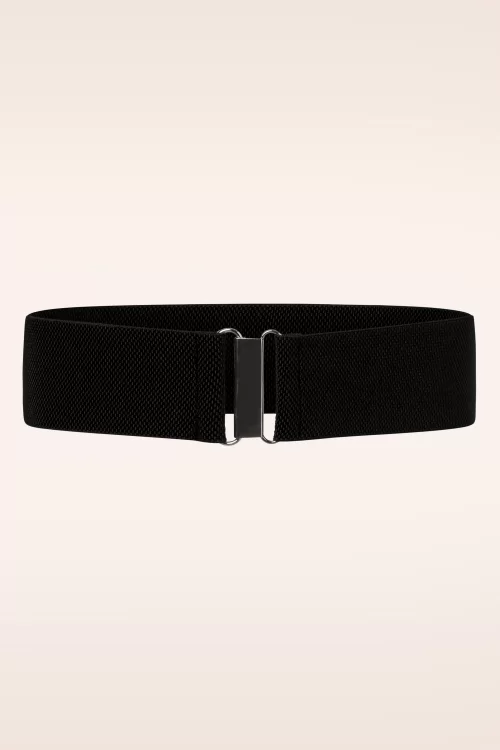 Deze 50s Gloria Stretch Riem in Zwart is dé ideale riem om iedere vintage outfit helemaal af te maken! Gemaakt van breed zwart elastiek met een zilverkleurige gesp die sluit in de taille. Draag hem in combinatie met onze swing jurken om je taille te accentueren voor een prachtig silhouet!