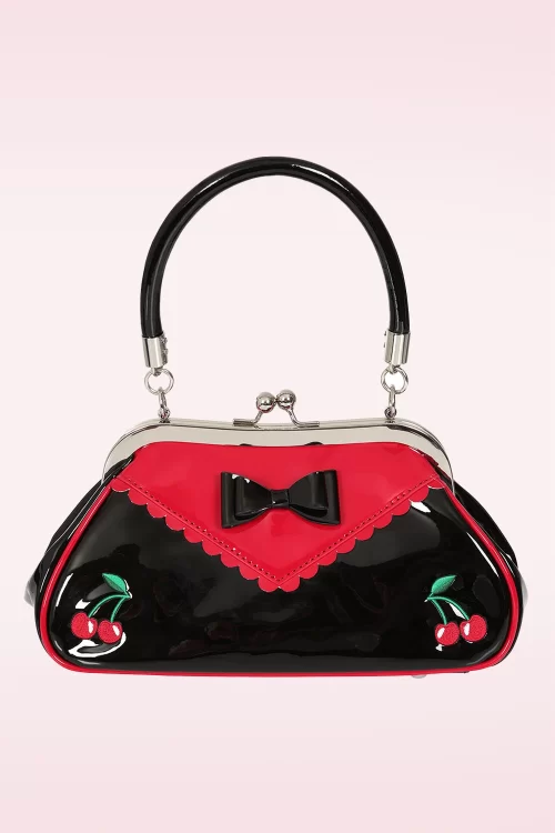 Nieuwe collectie ~ “Glossy black and daring red, tied with a bow and kissed with cherries... sweet, but never innocent.” Deze kleine handtas in zwart en rood imitatie lakleder is precies groot genoeg voor al je essentials en is afgewerkt met een zilverkleurige klipsluiting, geborduurde kersjes en een kort, stevig hengsel.