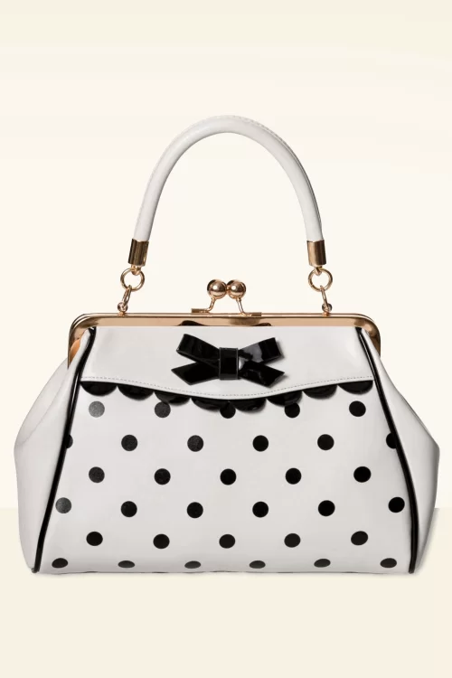 Nieuwe collectie ~ Echt een (polka)dotje! Deze tas in heel licht blushroze heeft een opvallende goudkleurige metalen klipsluiting voor een echte vintage look. Uitgevoerd in 'faux' leder met een print van zwarte polkadots, afgewerkt met een strikje en geschulpte biesjes. Deze cutie wordt bovendien geleverd met een los, verstelbaar hengsel zodat je haar ook speels om je schouder kunt hangen.