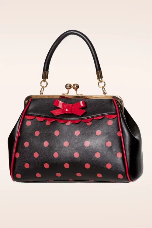 Nieuwe collectie ~ Echt een (polka)dotje! Deze zwarte tas heeft een opvallende goudkleurige metalen klipsluiting voor een echte vintage look. Uitgevoerd in 'faux' leder met een print van rode polkadots, afgewerkt met een strikje en geschulpte biesjes. Deze cutie wordt bovendien geleverd met een los, verstelbaar hengsel zodat je haar ook speels om je schouder kunt hangen.