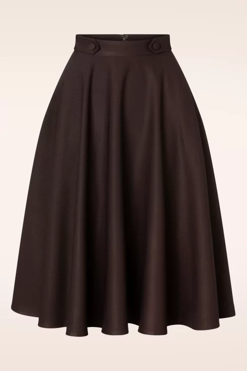 ''Swing your way into winter'' met deze Di Di Swing Skirt in Brown! Dit fifties pareltje draag je hoog in de taille, vanwaar zij uitloopt in een klassieke, elegante swing rok. De 'faux' knoopdetails in de zij vormen niet alleen een speels detail, maar benadrukken je taille ook nog eens extra. Uitgevoerd in een stevige maar soepel vallende, donkerbruine stof (stretcht amper) die prachtig met je mee beweegt. De winterperiode kan zo mooi zijn, zeker met een rok als Di Di in je kast! ;-)