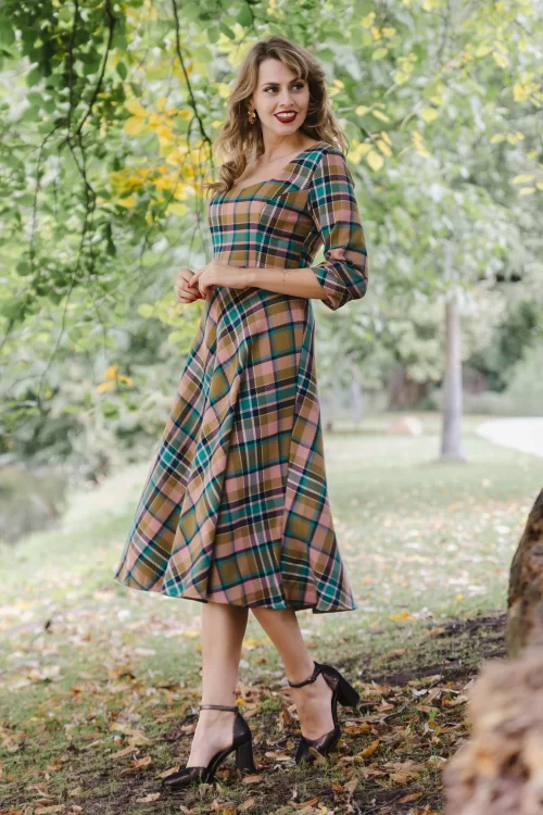 “A sweetheart in blush, wrapped in checks of quiet charm.”  Didi heeft een subtiele sweetheart halslijn, 3/4 mouwtjes met omslagjes en loopt vanaf de taille uit in een zwierige swing rok waardoor jij een super vrouwelijk silhouet krijgt. Uitgevoerd in een stevige en soepel vallende, geweven poederroze stofmix (stretcht niet!) met ruitjes in groen en blauwtinten, die heerlijk draagt.
