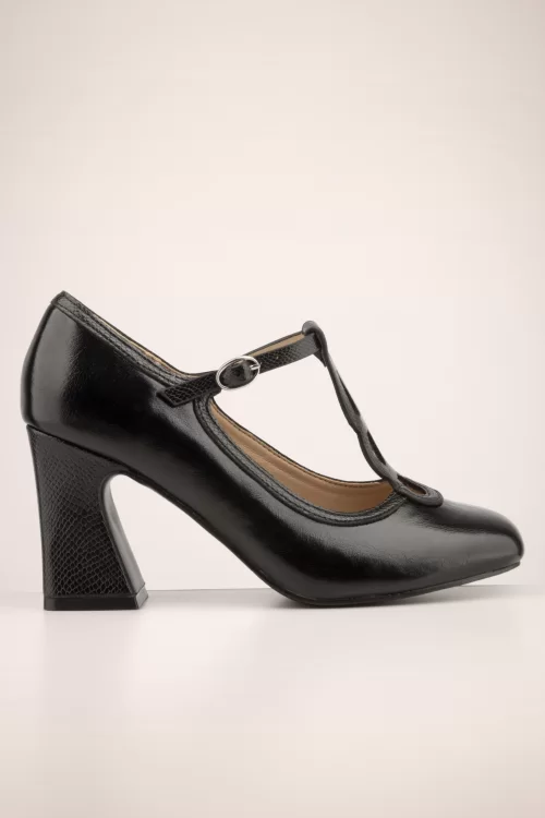 "Made for minis, eyeliner, and making an entrance." Sixties stijl pumps met een T-strap bandje en een asymmetrische hoge blokhak uitgevoerd in hoogwaardig zwart kunstleder.