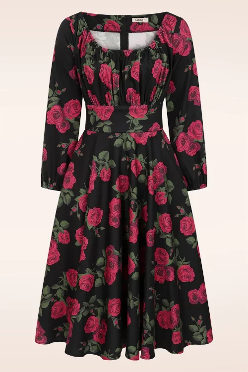 “A swing of roses, bold and unforgettable.” Deze swing jurk heeft een Carmen halslijn, lange mouwen en is uitgevoerd in een soepel vallende, zwarte katoenmix met een hele lichte stretch en een klassieke print van rode rozen.