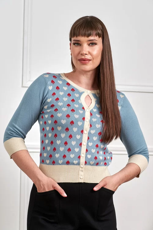 Nieuwe lente/zomercollectie ~ “Wear your heart out.” Deze cutie is uitgevoerd in een zachte, fijngebreide viscosemix in een prachtige tealblauwe tint en is voorzien van een speelse hartjesprint in crème en rood.