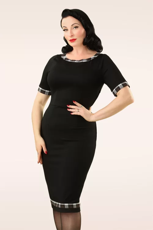 Deze Work It Out Check Trim Pencil Dress in Black is sexy EN super sophisticated! Dit nauw aansluitende prachtexemplaar heeft een elegante boothals, korte mouwen en contrasterende geruite biezen. Uitgevoerd in een stevige maar soepele, zwarte stof met een lichte stretch die je rondingen prachtig benadrukt. Omarm het verleden en herleef de fabulous fifties in deze beauty!