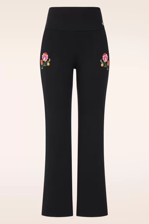 “Flared in flow, blossomed in detail; jersey comfort with floral grace.” Deze heerlijke en comfy flared broek is uitgevoerd in een iets dikkere, stretchy, zwarte bio katoenmix, voorzien van geborduurde bloemen op heuphoogte.