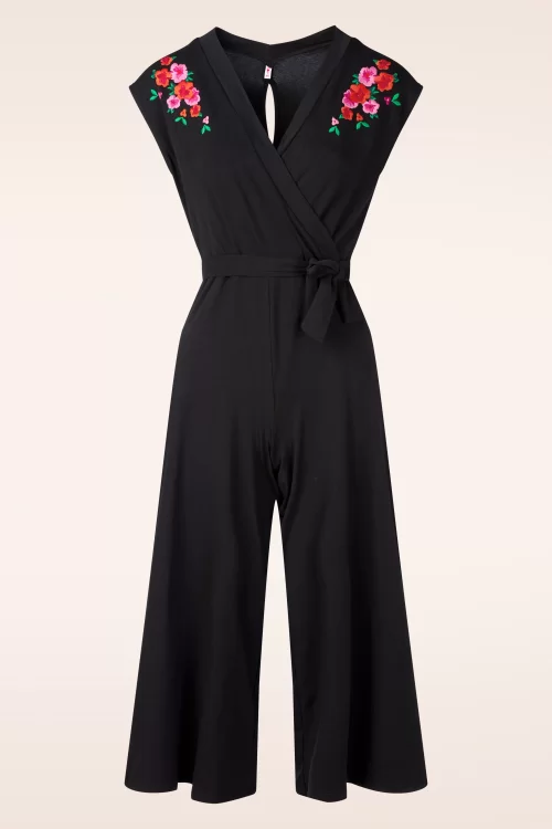 Nieuwe lente/zomercollectie ~ “Easy to wear, impossible to ignore.” Deze comfy beauty heeft een vaste overslagtop, strikbanden in de taille en wijde culottepijpen die soepel met je meebewegen. Ze is uitgevoerd in een supercomfortabele, stretchy organische katoenmix in zwart en afgewerkt met geborduurde bloemen aan de voorzijde.