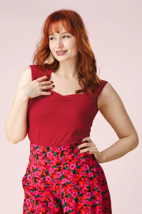 Zie jij alle fantastische combi's met deze top al voor je?! De diamantvormige halslijn is afgewerkt met een kanten biesje en zorgt ervoor dat je een prachtig decolleté laat zien. Uitgevoerd in een stretchy, kersenrode bio katoenmix voor een mooie aansluitende pasvorm. Waar je haar ook mee combineert, ze zal alle outfits omtoveren in een prachtplaatje!