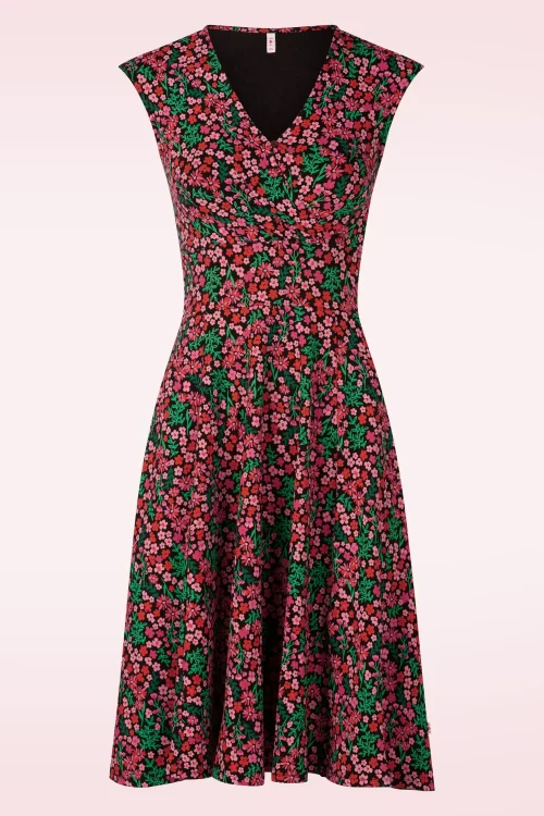 Nieuwe lente/zomercollectie ~ “Bloom in every step.” Deze mouwloze beauty heeft een elegante V-halslijn met vaste overslag en flatterende plooitjes. De subtiele tailleband accentueert je figuur op een natuurlijke manier, terwijl de knielange, zwierige rok prachtig met je meebeweegt. Ze is uitgevoerd in een supercomfortabele, stretchy biologische katoenmix in zwart met een bloemetjesprint in groen, roze en rode tinten.