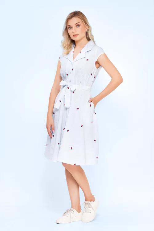 Nieuwe lente/zomercollectie ~ “Stripes, strawberries, and a touch of retro.” Deze retro beauty heeft een reverskraagje, korte kapmouwtjes, een afneembaar striklint en is voorzien van handige steekzakjes. Ze is uitgevoerd in een stevige, maar soepel vallende katoen met een lichtblauw-wit gestreepte print, afgewerkt met geborduurde aardbeien, die heerlijk draagt.