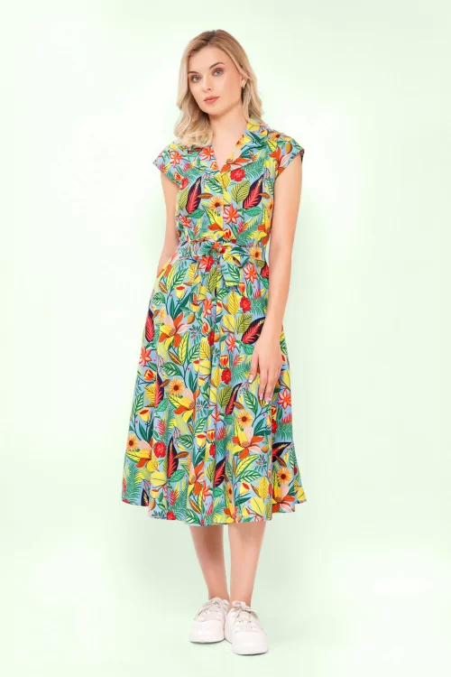 Nieuwe lente/zomercollectie ~ ''A touch of retro, a burst of flowers.'' Deze retro beauty heeft een reverskraagje, korte kapmouwtjes, een afneembaar striklint en is voorzien van handige steekzakjes. Ze is uitgevoerd in een stevige, maar soepel vallende katoenmix met een lichte stretch in lichtblauw, die heerlijk draagt en is voorzien van een kleurrijke bloemenprint.