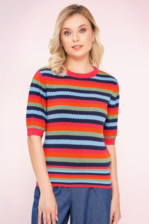 Nieuwe lente/zomercollectie ~ “Hello knitted pretty!” Deze schattige gebreide top is uitgevoerd in fijngebreide, soepele en stretchy organische katoen en is voorzien van een gekleurd, geschulpt streepjespatroon in groen-, blauw- en rozetinten.
