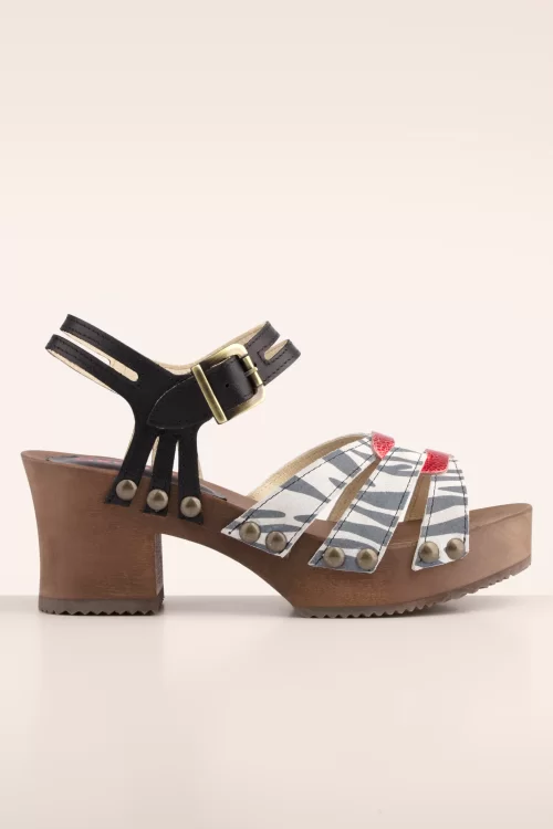 Nieuwe lente/zomercollectie ~ “Zebra stripes, sunny vibes.” Retro klompjes met een blokhak en een plateauzool van hout. Ze zijn handgemaakt van hoogwaardig leder/suède met een zebraprint, een zwart verstelbaar enkelbandje en een metallic rood detail op de wreef.
