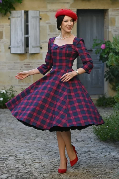 "Twirl into tartan magic!" Deze swing jurk brengt instant fifties flair in je garderobe! De klassieke rood-blauwe tartanprint, subtiele sweetheart halslijn en 3/4 pofmouwen geven haar een vrolijke, retro look. Handige zakken en een stevige maar soepele katoenmix maken haar comfortabel én perfect om elegant rond te draaien bij elke gelegenheid.