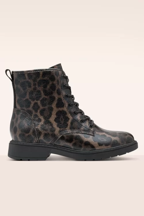 “Sustainable sass, spotted in style.” Deze enkellaarsjes met veter- en ritssluiting hebben een brede pasvorm en zijn uitgevoerd in hoogwaardig vegan leder met donkere leopard print en een stevige zool.