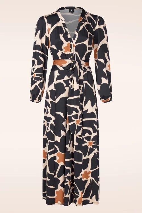 Ga voor het maximale WOW effect in deze jurk! Jamie heeft een V-hals, knoopjes bij de buste, lange pofmouwen en een stoffen riem in de taille zodat deze mooi geaccentueerd wordt. Uitgevoerd in een soepele en stretchy, gladde slinky stof met een StayFresh coating en een kleurrijke print in latte, donker navy en bruin.