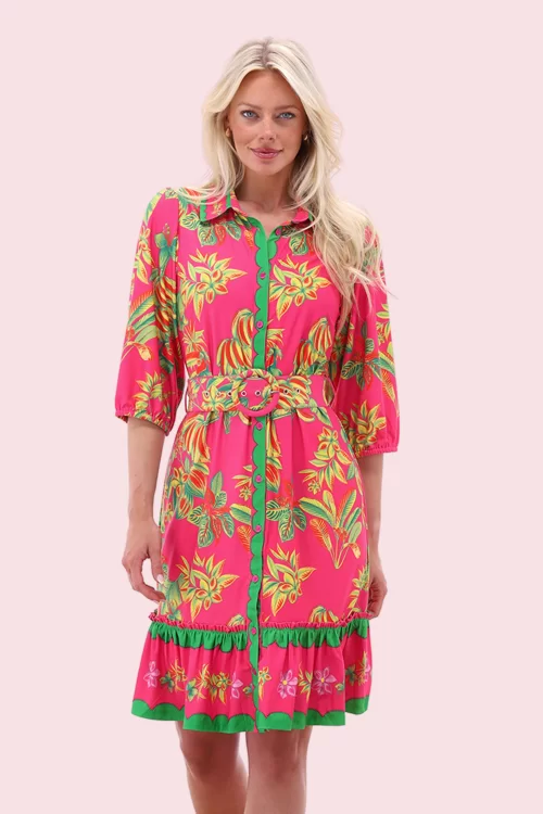 Nieuwe lente/zomercollectie ~ “Neon dreams, tropical scenes.” Deze zomerse blikvanger heeft een puntige kraag, een functionele knopenreeks, 3/4 pofmouwen met elastiek en een speelse roezel aan de onderzijde. Dankzij de afneembare riem kun je haar mooi tailleren. Uitgevoerd in een soepele, stretchy slinky stof met een subtiele glans, in neonroze met een kleurrijke tropische bloemenprint.