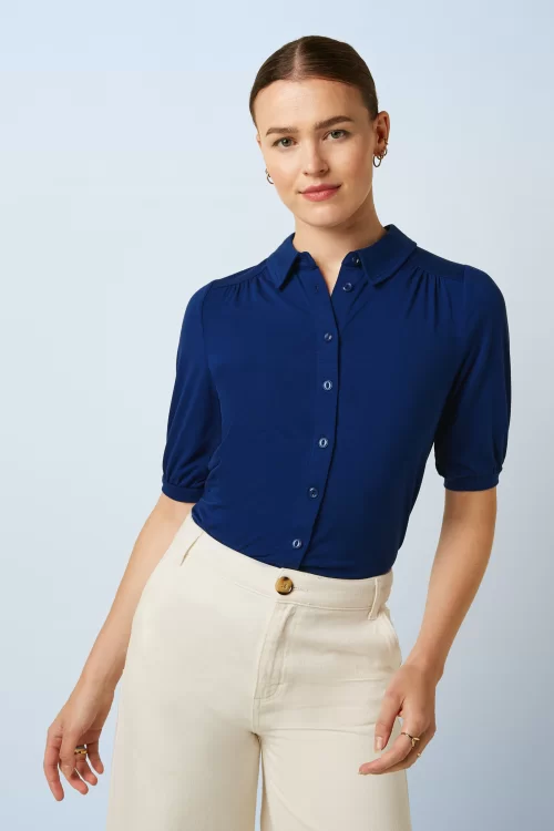 “De combinatiemogelijkheden zijn eindeloos met Carina!” Deze tijdloze beauty heeft een puntig kraagje, 1/2 pofmouwtjes en een elegante knopenreeks aan de voorzijde. Ze is uitgevoerd in een zachte, soepele viscose/lyocellmix met stretch en een vleugje circulose, in een prachtige mazarineblauwe tint — een genot om te dragen!