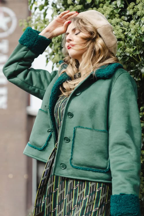 “Lammy love in pine.” Zo zacht en heerlijk warm... Dina is met haar kortere stijltje de perfecte, speelse toevoeging voor jouw garderobe dit najaar. Uitgevoerd in een heerlijk zachte en dikkere, gerecyclede pinegroene imitatie suède stof (stretcht niet!) met de typische 'lammy' details.