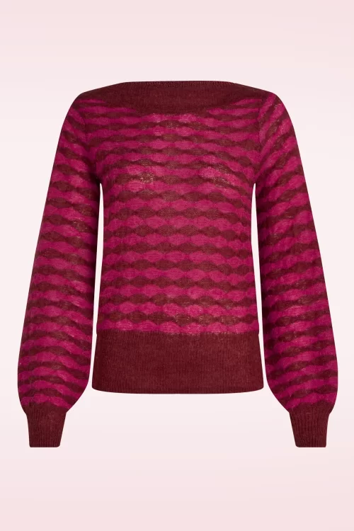 "Funky knits, dazzling hits!'' Erin heeft opvallende lange bisschopsmouwen voor extra flair, een hoge boothals en is uitgevoerd in een grofgebreide, zachte, soepele en stretchy acrylmix met een vleugje (alpaca)wol. Ze is voorzien van een seventies streeppatroon in roze en roestrood.