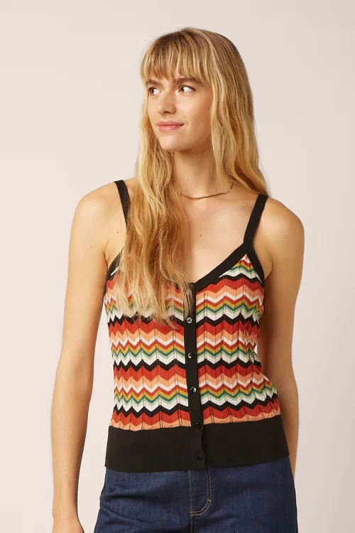 “Zigzag your way into summer!” Deze cutie heeft een aansluitende pasvorm, spaghetti bandjes en een reeks knopen aan de voorzijde. Ze is uitgevoerd in een soepele, fijngebreide organische katoenmix met een kleurrijk zigzagpatroon en een opengewerkt ajourpatroon, die heerlijk draagt.