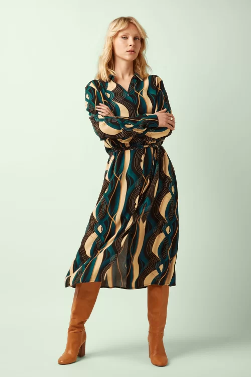 “A graphic vision, wrapped in eco-conscious style.” Deze midi doorknoopjurk is speels maar toch heel vrouwelijk door haar top met puntig kraagje, lange mouwen met manchet en het afneembare striklint in de taille. Uitgevoerd in een heerlijk soepele, zwarte EcoVero viscosemix (stretcht niet) met een grafische print.