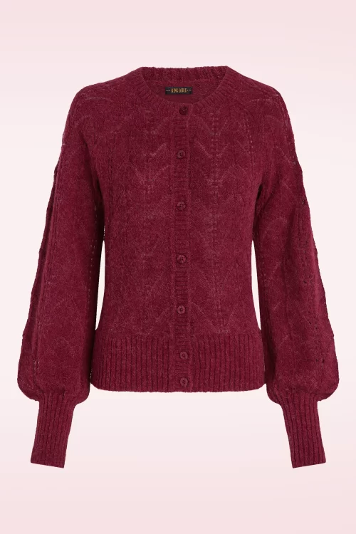 Deze cardigan is onmisbaar in je garderobe dit seizoen! Ze heeft een hoge halslijn, lange speelse bisschopsmouwen en is uitgevoerd in een fijngebreide, zachte, soepele en stretchy donkerrode stofmix met een vleugje alpaca en wol, afgewerkt met een klassiek opengewerkt patroon.