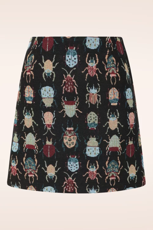“Printed to play, tailored to slay... this jacquard mini does both.” Dit speelse A-lijn rokje is uitgevoerd in een iets dikkere en stevige jacquard stof (stretcht niet!) met een print van kleurrijke kevers.