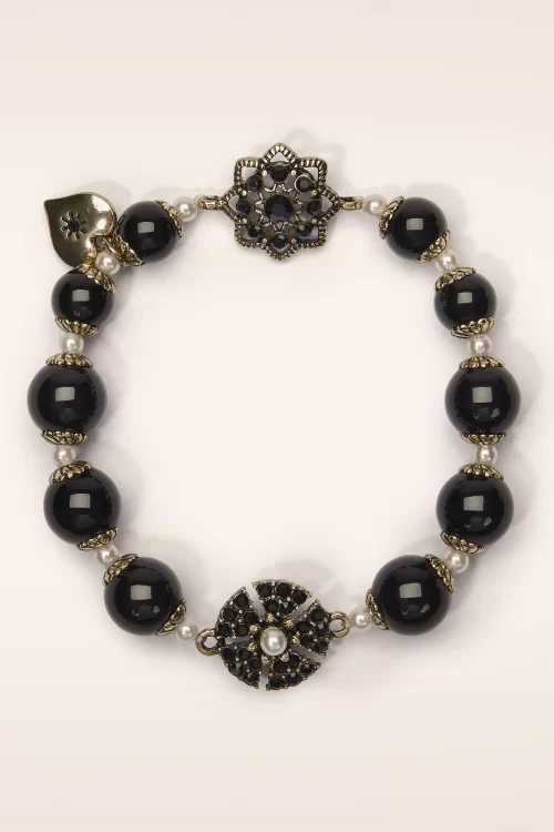 Tijdloos en klassiek! Deze elastische armband is voorzien van zwarte kralen, 'faux' parels, bloemetjes bezet met sprankelende strass steentjes en een klein hartvormig bedeltje.