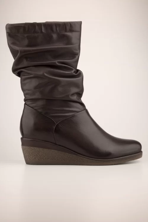 Comfy en stijlvol het nieuwe seizoen in! Deze gerimpelde boots met lage sleehak zijn uitgevoerd in hoogwaardig en soepel donkerbruin leder, afgewerkt met een handige ritssluiting.