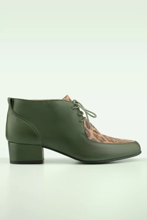 “Tamed comfort, wild detail.” Deze bosgroene booties met puntige neus en vetersluiting zijn uitgevoerd in high quality leder met een leopard print accent bij de instap.