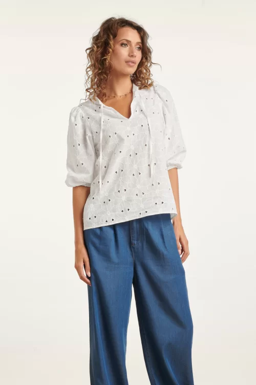 “Flirty, floral, fabulous.” Deze luchtige blouse heeft een losse pasvorm, een V-hals met vaste striklintjes en 3/4 pofmouwen met elastiek voor een elegante, vrouwelijke look. Het geborduurde bloemenmotief met opengewerkt patroon geeft een subtiele, romantische touch. Uitgevoerd in zachte, ademende katoen in wit, die heerlijk draagt.