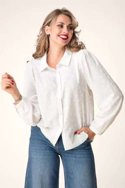Een en al liefde voor deze blouse! Uitgevoerd in een soepele witte stof (stretcht niet) die comfortabel draagt en voorzien is van een uniek hartjespatroon... LOVE!