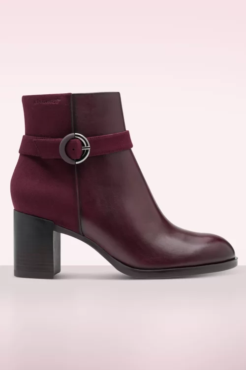''Rich in colour, rich in character.'' Deze enkellaarsjes zijn uitgevoerd in hoogwaardig wijnrood leder en suède met een stevige blokhak en een vast gesp detail.