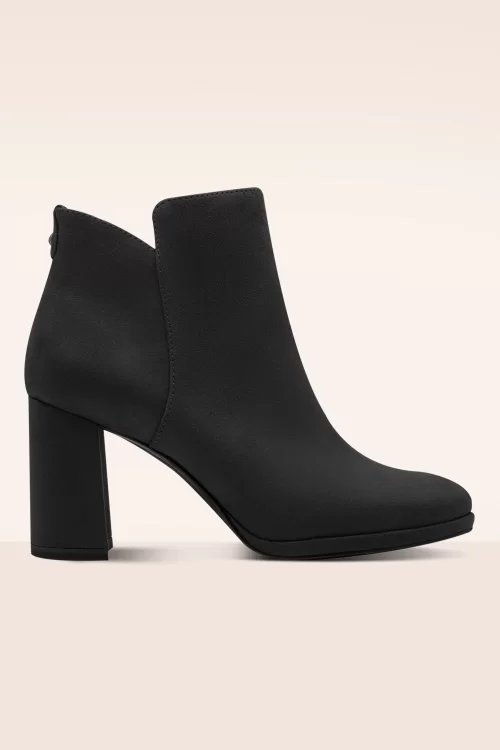 “Soft touch, strong stance.” Deze enkellaarsjes met hoge blokhak en subtiel plateau zijn uitgevoerd in zwart vegan suèdine.