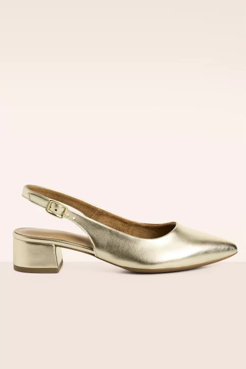 Nieuwe collectie ~ “Step in gold, leave a glow!” Deze slingbacks zijn uitgevoerd in metallic goud kunstleder, voorzien van een blokhak, een zacht voetbed en een spits neusje.