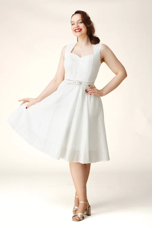 Nieuwe lente/zomercollectie ~ “Soft as a dream, made to be seen.” Deze witte swing beauty van Topvintage Boutique is met liefde ontworpen door onze eigen in-house designers en exclusief bij Topvintage verkrijgbaar. Het verfijnde broderie anglaise patroon, de sweetheart halslijn en de zwierige swing rok geven haar een luchtige, dromerige uitstraling. Ze is volledig gevoerd en uitgevoerd in een soepele katoenmix die sierlijk met je meebeweegt en zorgt voor een elegante, vrouwelijke pasvorm.
