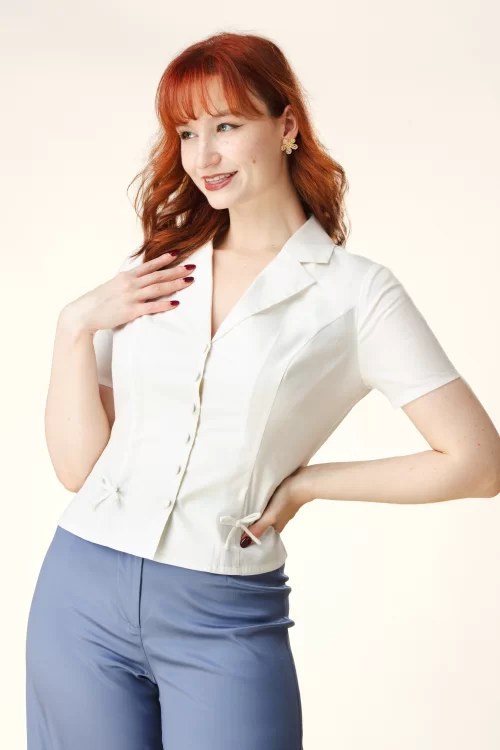 Nieuwe lente/zomercollectie ~ “Simply elegant, forever charming.” Deze Lulu blouse van Topvintage Boutique is ontworpen door onze eigen in-house designers en exclusief bij Topvintage verkrijgbaar. Ze is uitgevoerd in een frisse gebroken witte katoenmix en voorzien van een klassieke reverskraag, korte mouwen en een stoffen knopenreeks aan de voorzijde. De licht getailleerde pasvorm wordt subtiel geaccentueerd door twee lieflijke, decoratieve strikjes aan de voorkant, wat zorgt voor een vrouwelijke en verfijnde uitstraling.