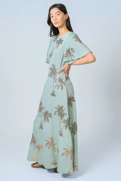 Nieuwe lente/zomercollectie ~ “Sway into summer with a touch of golden elegance.” Rene heeft korte vlindermouwtjes en een elegante V-rug voor een vrouwelijke touch, terwijl de flowy rok heerlijk met je mee zwiert. Dankzij de soepel vallende katoen draagt ze supercomfortabel en luchtig. De lichtblauwe stof (100% katoen) is afgewerkt met een speelse print van goudkleurige pailletten in de vorm van palmbomen, wat zorgt voor een subtiele, zomerse sparkle.