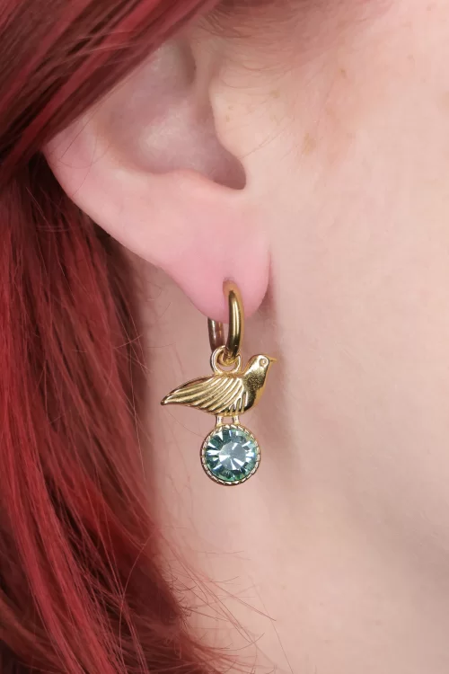 Nieuwe collectie ~ “Let your style take flight.” Deze schattige oorbellen laten je hart meteen een beetje fladderen! De hangertjes met een lief vogeltje zijn gemaakt van 18k verguld roestvrij staal en worden speels aangevuld met een facetgeslepen rhinestone in een groenblauwe tint die prachtig het licht vangt.