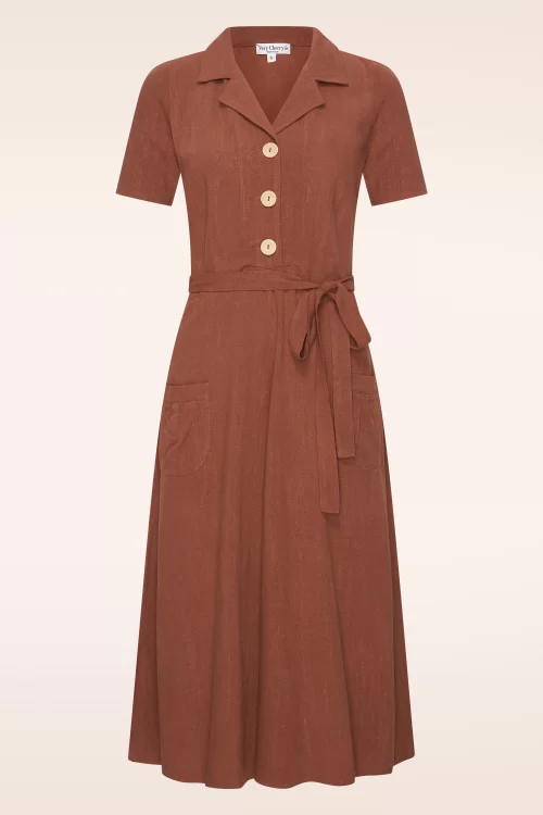 Nieuwe lente/zomercollectie ~ Voeg wat 'fourties flair' toe aan je garderobe met deze Revers linnen midi jurk in terracotta! Ze heeft een V-halslijn met een speels revers kraagje, korte pofmouwen en een reeks grote knopen. Het striklint accentueert je taille voor een super vrouwelijk silhouet en de opgenaaide zakjes aan de voorzijde geven haar een speelse touch! Uitgevoerd in een luchtige en soepel vallende, linnen/- viscosemix (stretcht niet), die heerlijk draagt.