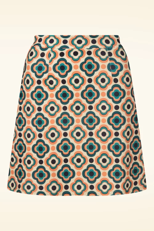 Nieuwe collectie ~ “A little retro, a lot of fun.” Ze wordt hoog in de taille gedragen vanwaar ze uitloopt in een speels A-lijntje. Uitgevoerd in een stevige maar stretchy, crèmekleurige stof met een fantastische retro bloemenprint in oranje en teal tinten.
