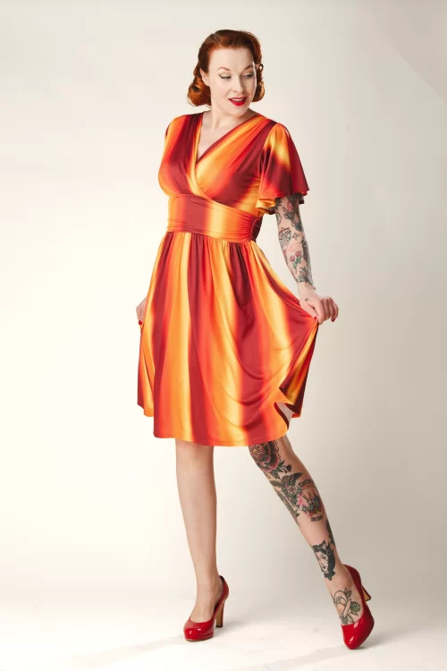 Nieuwe collectie ~ Een echte vintage beauty, perfect voor elke gelegenheid! Sadie heeft een vaste overslag, korte vlindermouwtjes en loopt vanaf de taille uit in een zwierige semi-swing rok. Ze is uitgevoerd in een gladde, soepele en stretchy slinky stof met een print van vervaagde strepen in warme oranje- en geeltinten. Licht van gewicht, kreukvrij én heerlijk comfortabel om te dragen. Geniet van de complimentjes zodra je Sadie aantrekt!